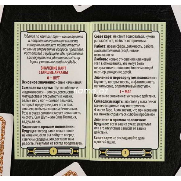В инструкции вы найдёте подробное описание каждой карты, а также её значение в прямом и перевёрнутом положении. Кроме этого, в инструкции находится подробное описание, значение и особенности основных раскладов: «Три карты», «Подкова», «Обретение любви». К каждому раскладу прилагается изображение.