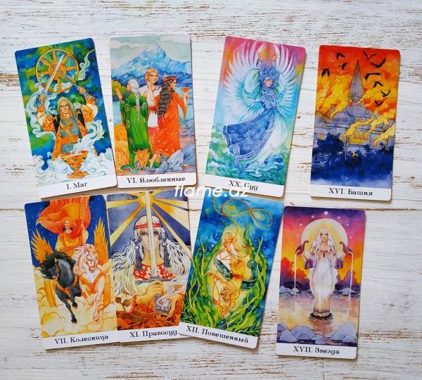 Вдохновленный волшебством и мудростью русских сказок, Таро Золотого Колеса интерпретирует традиционное Таро через призму колоритной славянской народной культуры. В этой лучистой колоде Золотого Колеса - священный символ судьбы, солнце и бесконечные циклы жизни сопровождают Дурака в его путешествии через Старшие и Малые Арканы.