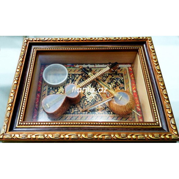 Сувенир из дерева, состоящий из музыкальных инструментов в рамке.
