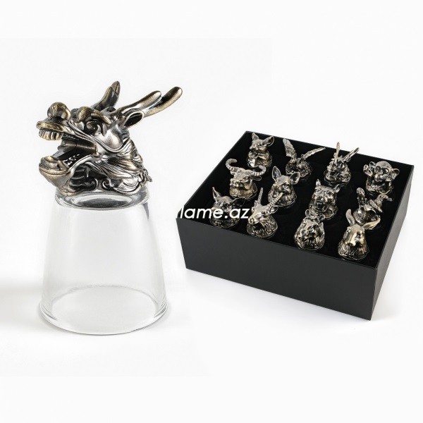 Двенадцать не граненых сувенирных рюмок, основание которых выполнено под 12 зодиакальных животных.